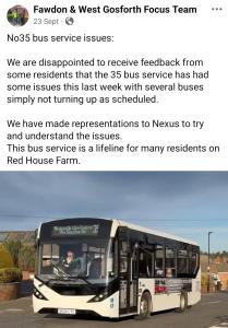 I was made aware of a post on a local Facebook group complaining about the reliability of service 35 recently, suggesting that buses weren't turning up or where vans with no clear indication it was running the service.