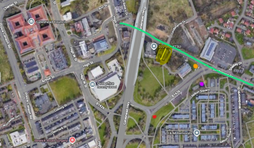 The yellow is where the School is at Bede House, the Red is where I was taking photos from and have done several times in the past as have other spotters in the local area, I was aware of the School being there and ensured when taking photos my camera was not pointing in the direction of it and more down towards Aldi/Chad House and I had zoomed in an appropriate amount to ensure focus of my photos were on the Buses. Police had no issues with the photos I had taken after asking to view them on my camera.